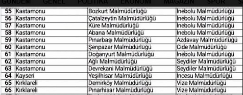 Paylaşılan listeye göre Bozkurt Mal Müdürlüğünün kapatılarak İnebolu Mal Müdürlüğüne bağlanacak.